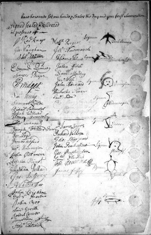 Figure: Signatures on the Treaty of Portsmouth (1713). Note pictographs of the Wabanaki on the right side of the document. Wikimedia.